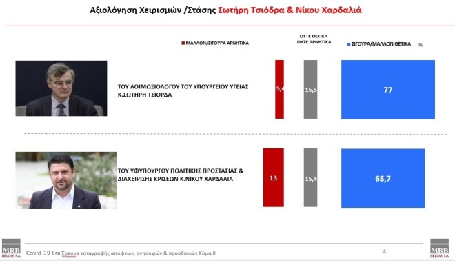 Επίσης, το 77% αξιολογεί θετικά τους χειρισμούς του Σ. Τσιόδρα, και το 68,7% τους χειρισμούς του Ν. Χαρδαλιά.