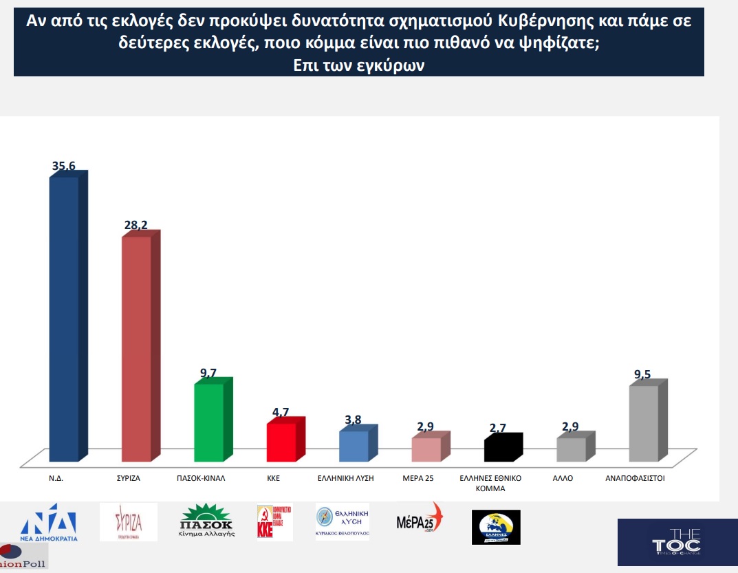 9. Ενδιαφέρον παρουσιάζουν τα αποτελέσματα στο ερώτημα τι θα ψηφίσουν αν δεν προκύψει Κυβέρνηση από τις πρώτες εκλογές και οδηγηθούμε σε δεύτερες εκλογές. Στην πρόθεση ψήφου εμφανίζονται οι εξής επιδόσεις: Ν.Δ 33.9% , ΣΥΡΙΖΑ 26.8%, ΠΑΣΟΚ 9.2%, Κ.Κ.Ε 4.5% , ΕΛΛΗΝΙΚΗ ΛΥΣΗ 3.6%, ΜΕΡΑ 25 2.8%, ΕΛΛΗΝΕΣ 2.6%, ΑΛΛΟ 2.8%, ΛΕΥΚΟ/ΑΚΥΡΟ 1.3%, ΑΠΟΧΗ 3.5%, ΑΝΑΠΟΦΑΣΙΣΤΟΙ 9%.