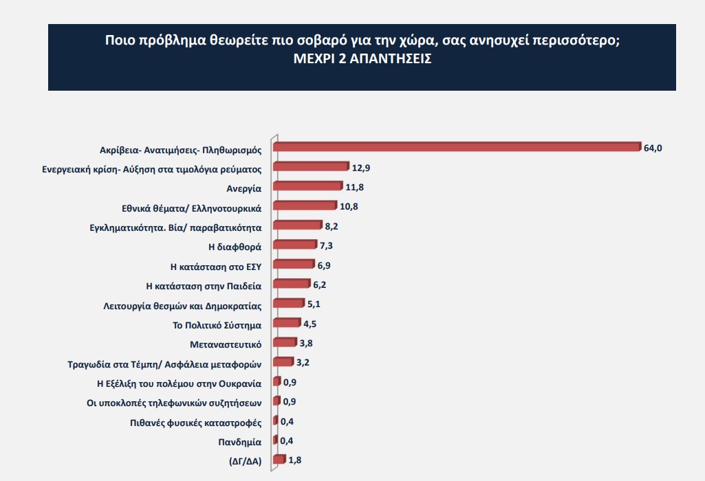 2. Το θέμα της ακρίβειας κυριαρχεί απόλυτα με 64% στα προβλήματα που ιεραρχούν οι πολίτες και ακολουθούν τα τιμολόγια ενέργειας με 12.9%, η ανεργία με 11.8% και τα εθνικά θέματα με 10.8%, ενώ ακολουθούν η εγκληματικότητα/ παραβατικότητα με 8.2%, η διαφθορά με 7.3% και η κατάσταση στο Ε.Σ.Υ με 6.2%