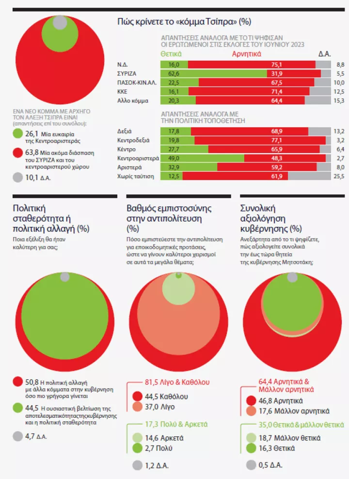 Όσον αφορά την δημιουργία ενός κόμματος από τον πρώην πρωθυπουργό Αλέξη Τσίπρα, το συντριπτικό 63,8% του δείγματος της Marc δηλώνει ότι το βλέπει ως «μια ακόμα διάσπαση του ΣΥΡΙΖΑ και του κεντροαριστερού χώρου».